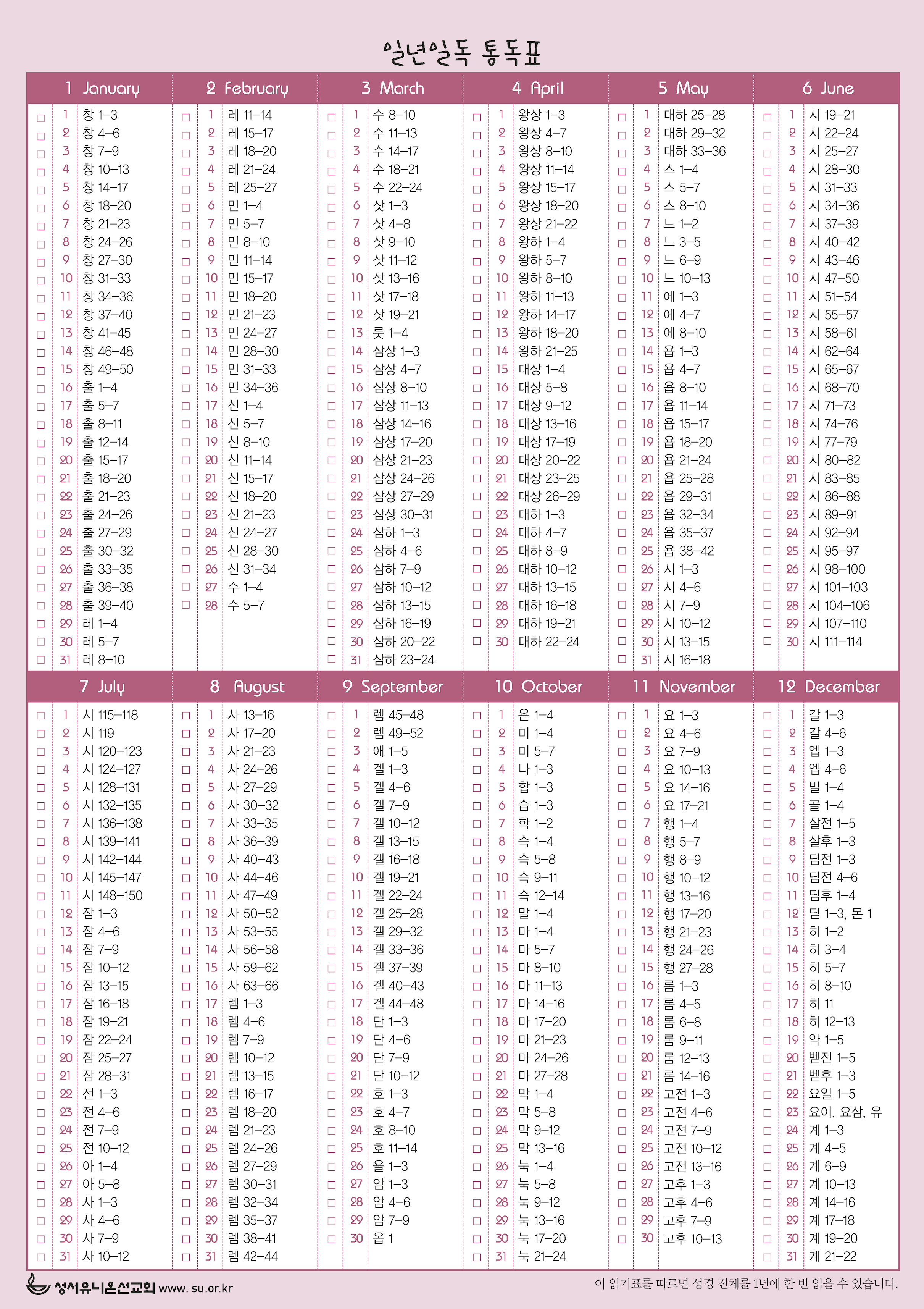 💡 팁: 이 읽기 일정을 따라 읽으면 성경 전체를 1년에 한 번 읽을 수 있습니다.